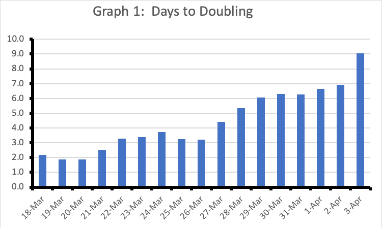 Interestingly, Graph 1 shows a steady increase in the “Days to Doubling” trend has occurred during the past couple of weeks.
