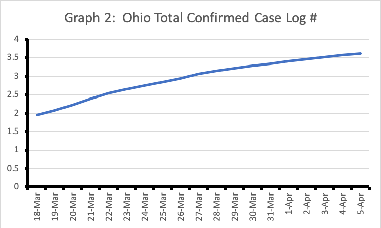 In Graph 2 the logarithmic number of Covid-19 cases in Ohio is reported. This graph is starting to show a logarithmic curve of the reported cases. We want to see this curve flatten out even more.