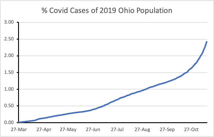 Unsurprisingly, the numbers of Covid-19 positive tests have increased during the Fall season (Fig. 1). This is the time of the year in Ohio when infectious diseases tend to become more prevalent. Absolute numbers of Covid-19 associated deaths have increased somewhat but not nearly at the rate of positive cases (Fig. 2).